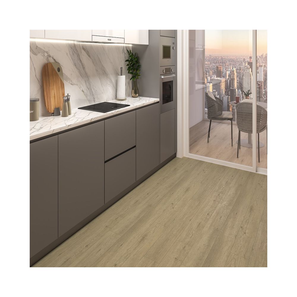 con acabado efecto madera clara, resistente y duradero. Fabricado en España con núcleo rígido SPC, es 100% impermeable, silencioso y resistente al desgaste, gracias a su base IXPE y fácil de instalar con sistema clic I4F. Ideal para hogares y espacios comerciales.