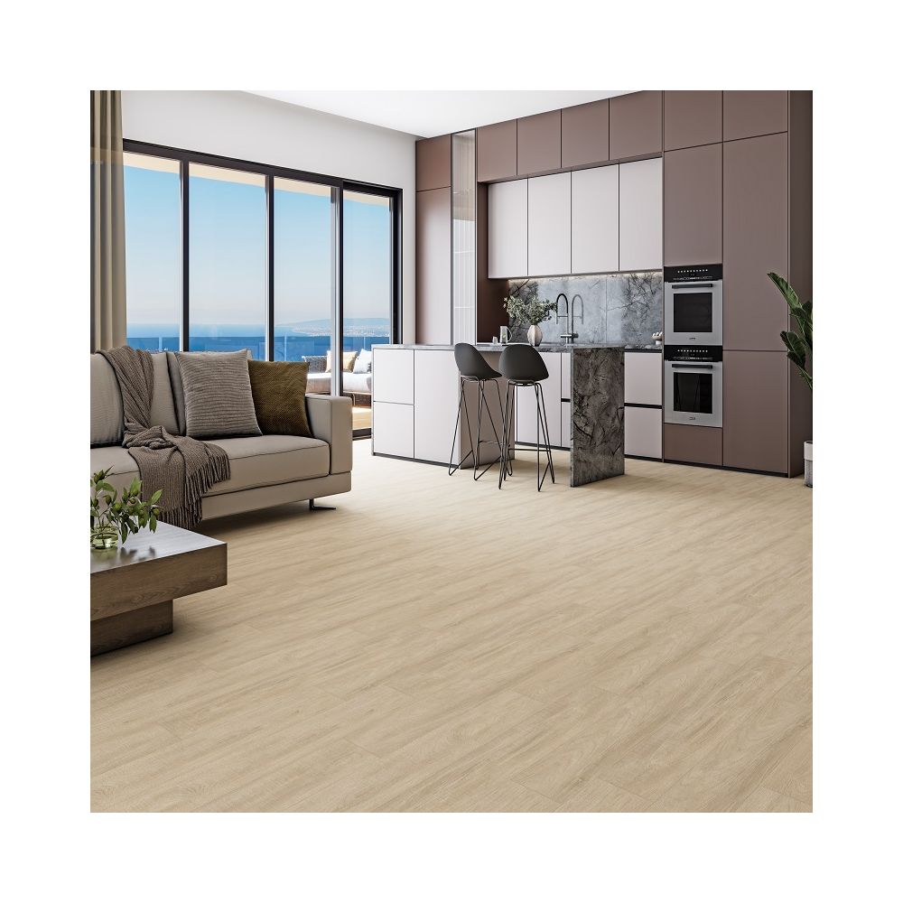 con acabado efecto madera natural, elegante y resistente. Fabricado en España con núcleo rígido SPC, es 100% impermeable, silencioso y resistente al desgaste, gracias a su base IXPE y fácil de instalar con sistema clic I4F. Ideal para hogares y espacios comerciales.