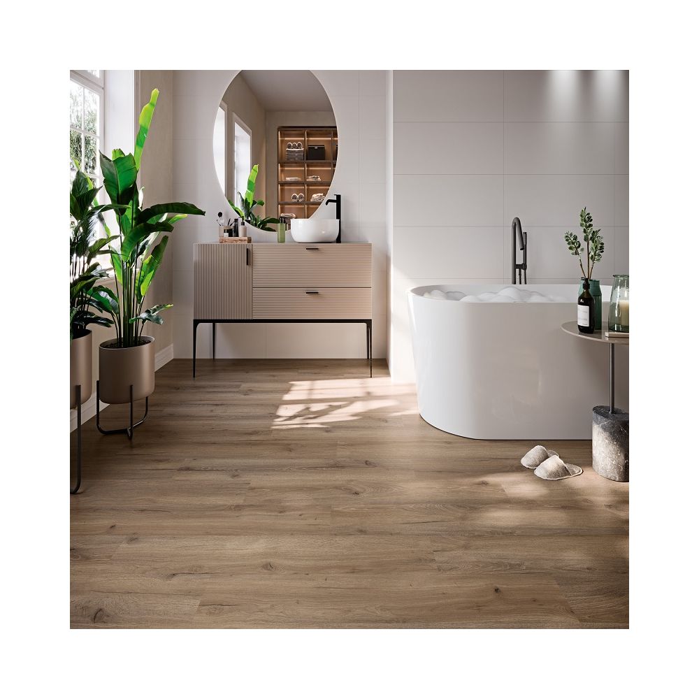 con acabado efecto madera natural, cálido y resistente. Fabricado en España con núcleo rígido SPC, es 100% impermeable, silencioso y resistente al desgaste, gracias a su base IXPE y fácil de instalar con sistema clic I4F. Ideal para hogares y espacios comerciales.