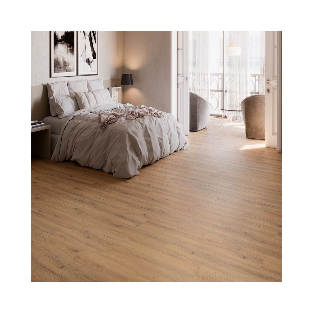 con acabado efecto madera natural, elegante y resistente. Fabricado en España con núcleo rígido SPC, es 100% impermeable, silencioso y resistente al desgaste, gracias a su base IXPE y fácil de instalar con sistema clic I4F. Ideal para hogares y espacios comerciales.