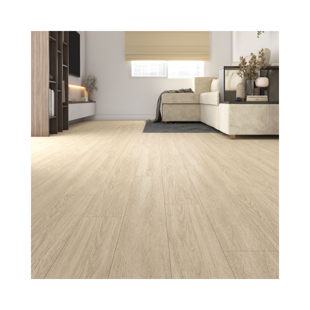 con acabado efecto madera natural, luminoso y resistente. Fabricado en España con núcleo rígido SPC, es 100% impermeable, silencioso y resistente al desgaste, gracias a su base IXPE y fácil de instalar con sistema clic I4F. Ideal para hogares y espacios comerciales.