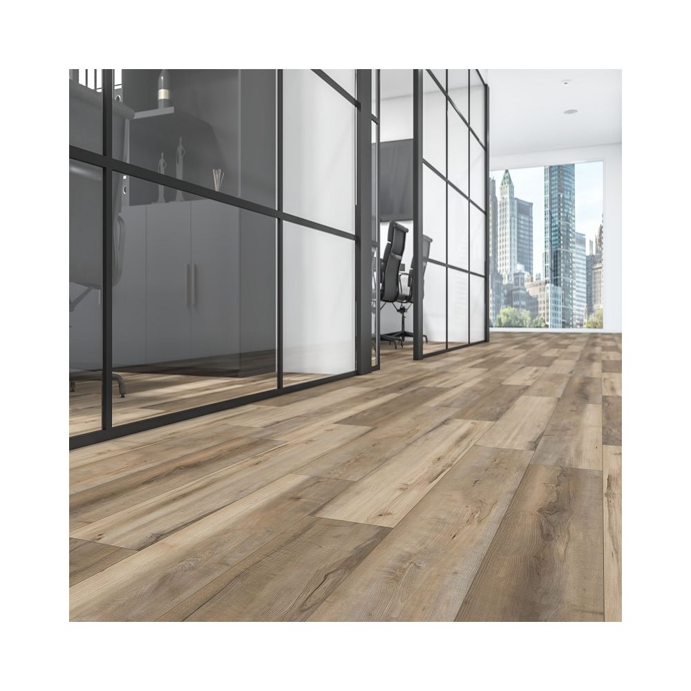 con acabado efecto madera clara, luminoso y resistente. Fabricado en España con núcleo rígido SPC, es 100% impermeable, silencioso y resistente al desgaste, gracias a su base IXPE y fácil de instalar con sistema clic I4F. Ideal para hogares y espacios comerciales.