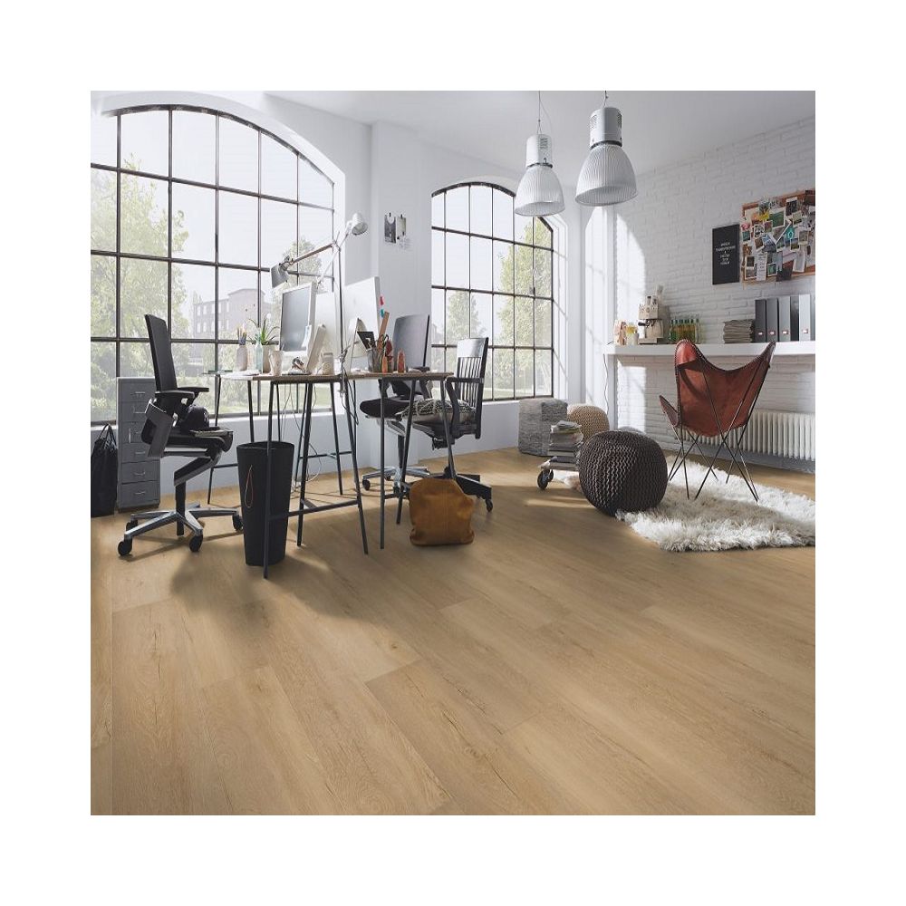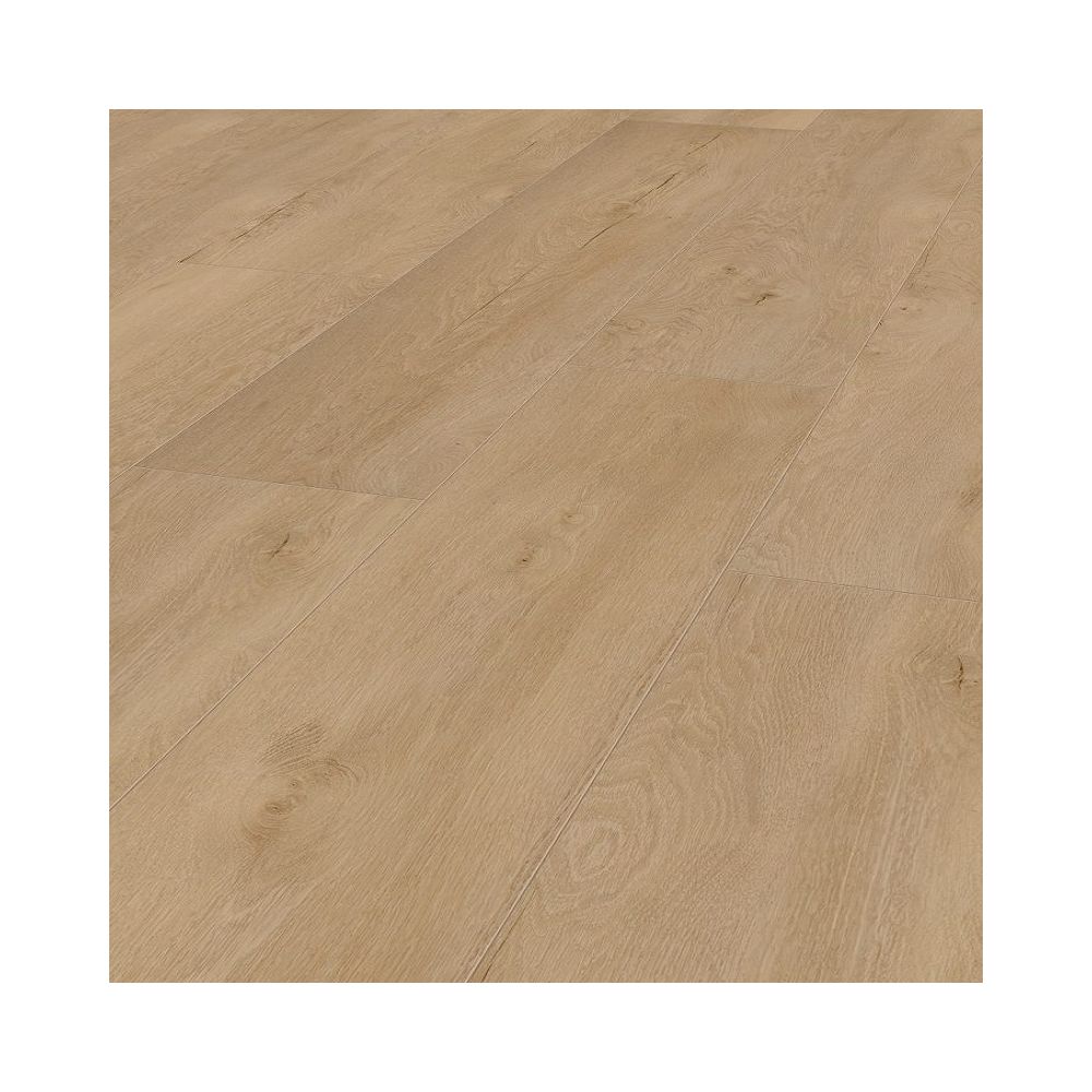 Cada lama cuenta con un formato extra ancho (1380 x 242 mm) y un grosor de 8 mm, lo que aporta mayor estabilidad, facilidad de instalación y una imagen moderna, ideal para ambientes abiertos. El acabado mate texturizado y el biselado a los 4 lados (4V) refuerzan el efecto visual de tabla real, creando un aspecto auténtico de parquet de madera natural.