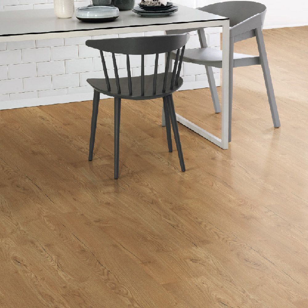 Este suelo laminado de 8 mm de grosor, con clasificación de uso 32, es perfecto para viviendas y locales comerciales de tránsito medio. Incorpora el sistema Aqua CLIC it!, que facilita la instalación y ofrece una resistencia al agua de hasta 24 horas, lo que lo hace ideal para entornos húmedos como cocinas, baños o zonas de entrada.