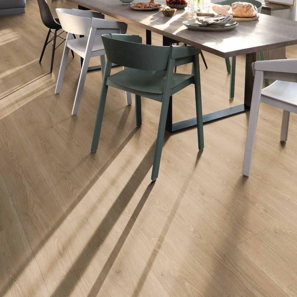 Su formato Classic (1292 x 193 mm) con biseles 4V realza el efecto de tablón real, mientras que su estructura AC4 / Clase 32 garantiza un alto rendimiento tanto en viviendas como en espacios comerciales de uso moderado. Resistente al agua durante 72 horas, este suelo es ideal para zonas como cocinas, entradas o pasillos.