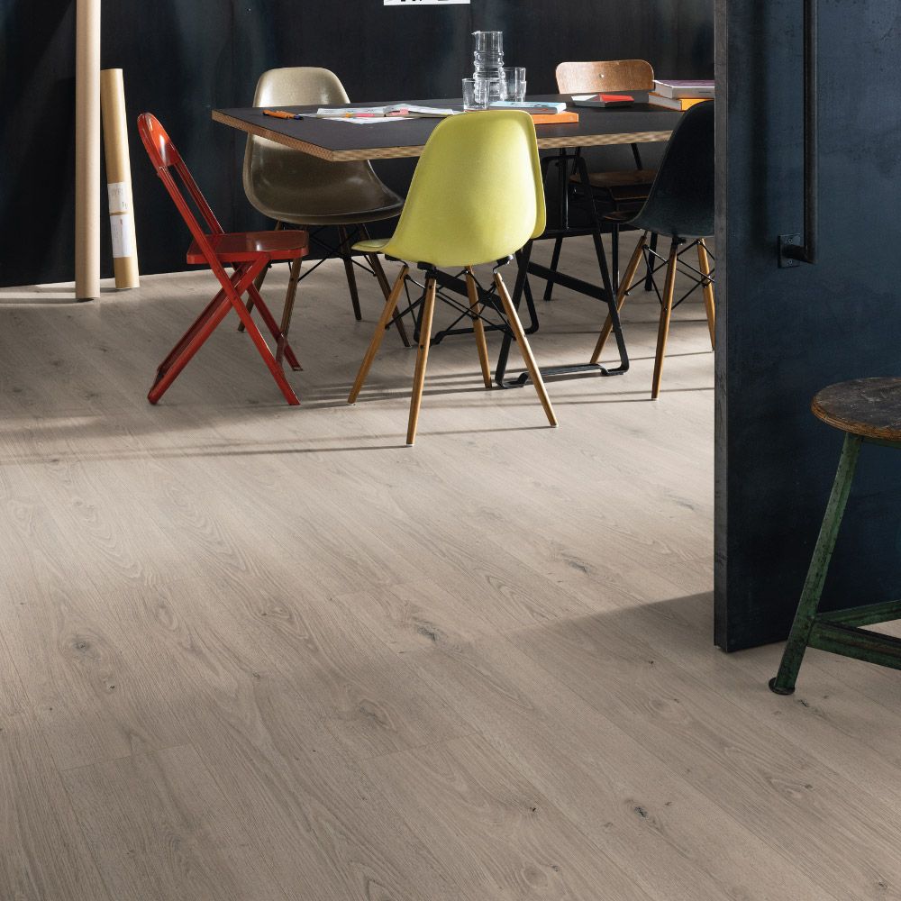 Apuesta por la funcionalidad, el diseño y la durabilidad con EGGER Roble Treviso Gris EL2184, un suelo laminado de alto rendimiento ideal para todo tipo de estancias.