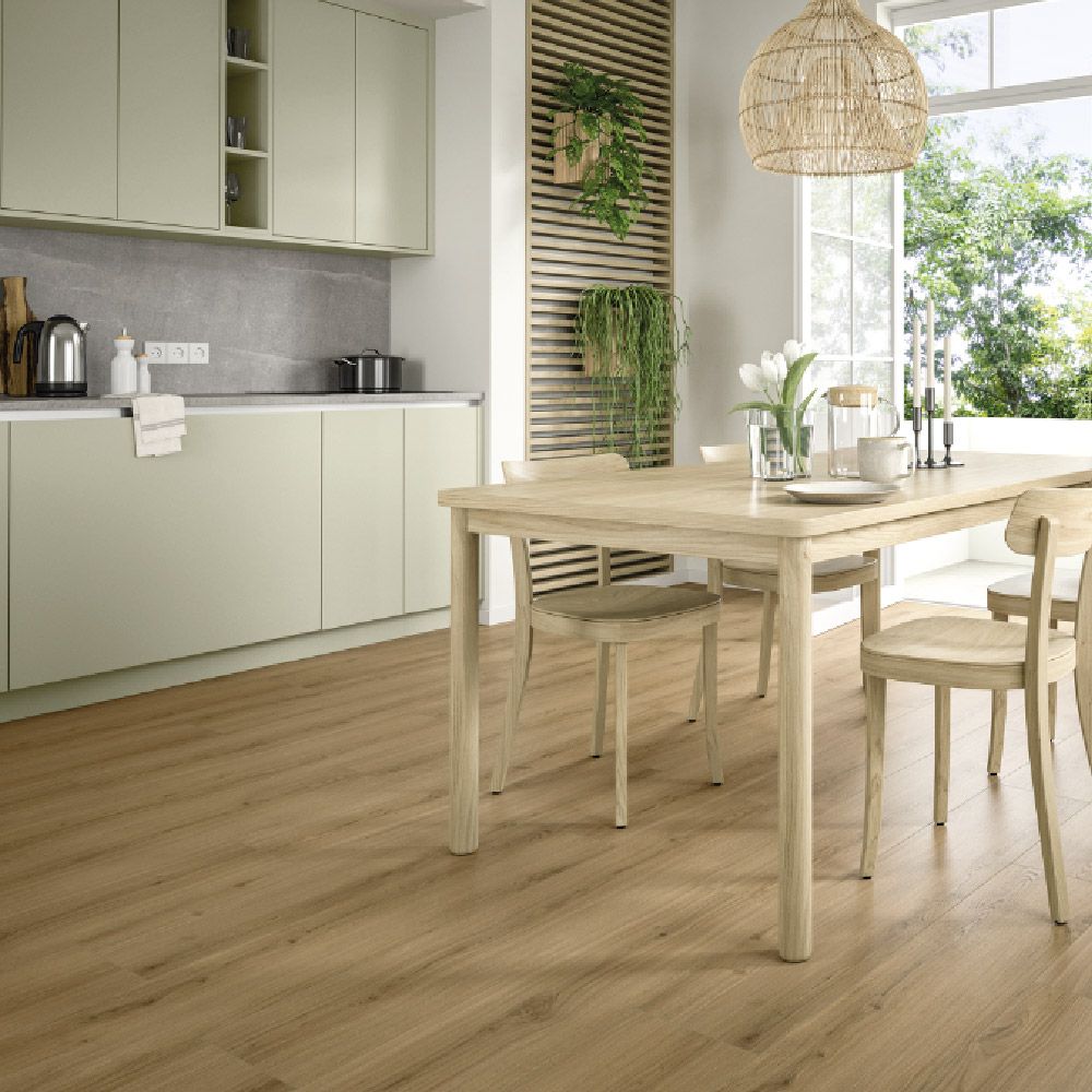 Gracias al formato de lama ancha y al biselado a los cuatro lados (4V), este suelo ofrece un aspecto más realista, generando una sensación visual de continuidad que amplía los espacios. Además, es resistente a la humedad durante 24 horas, ideal para zonas exigentes como cocinas, salones o zonas de tránsito frecuente.