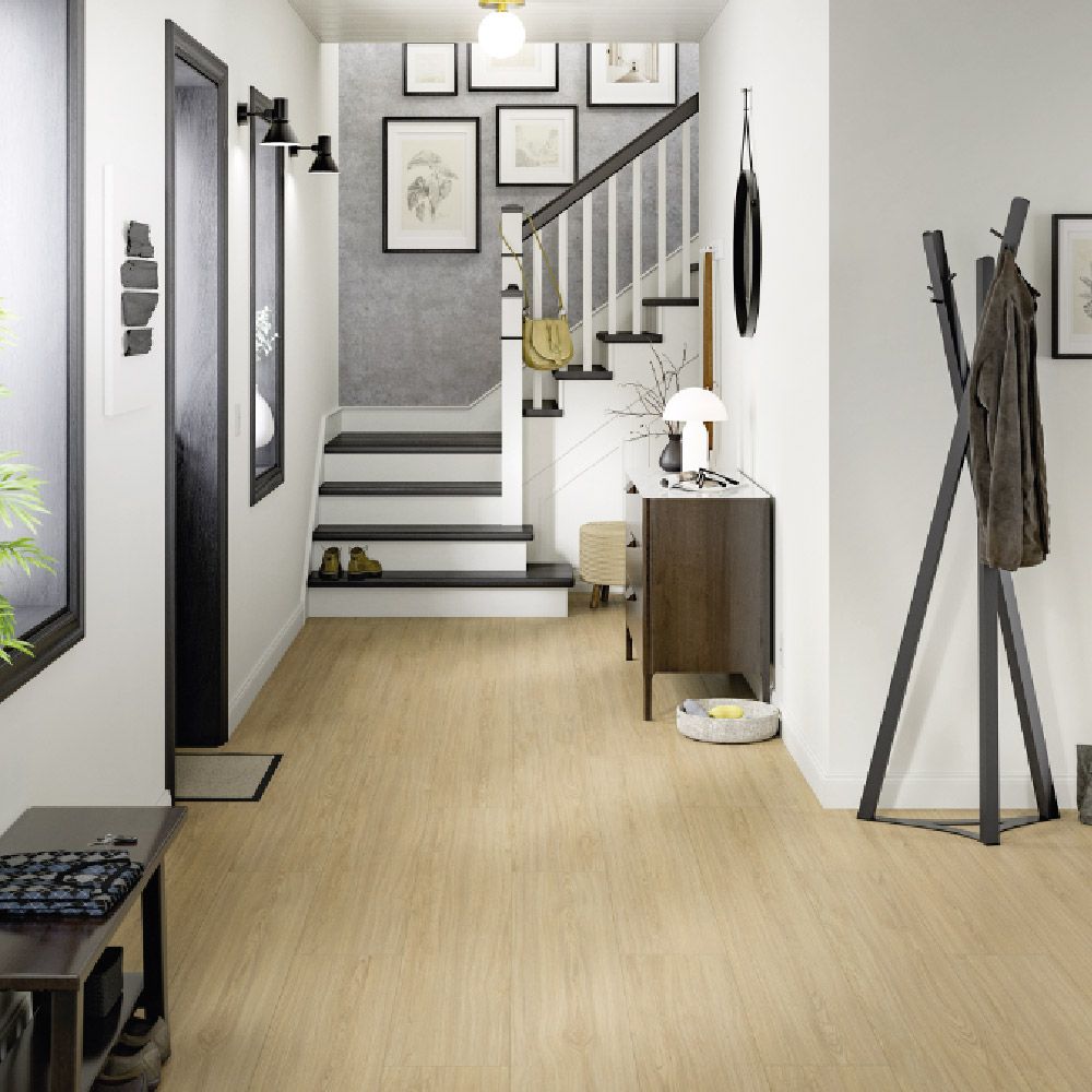 Gracias a su formato Large (1292 × 246 mm), aporta amplitud visual y continuidad en la instalación, reduciendo el número de juntas visibles. Con 8 mm de grosor, biselado 4V, y clasificación AC5 / Clase 33, está preparado para un uso intensivo tanto en entornos domésticos como comerciales. Además, es resistente al agua durante 72 horas, una ventaja clave para su colocación en cocinas, entradas y baños.