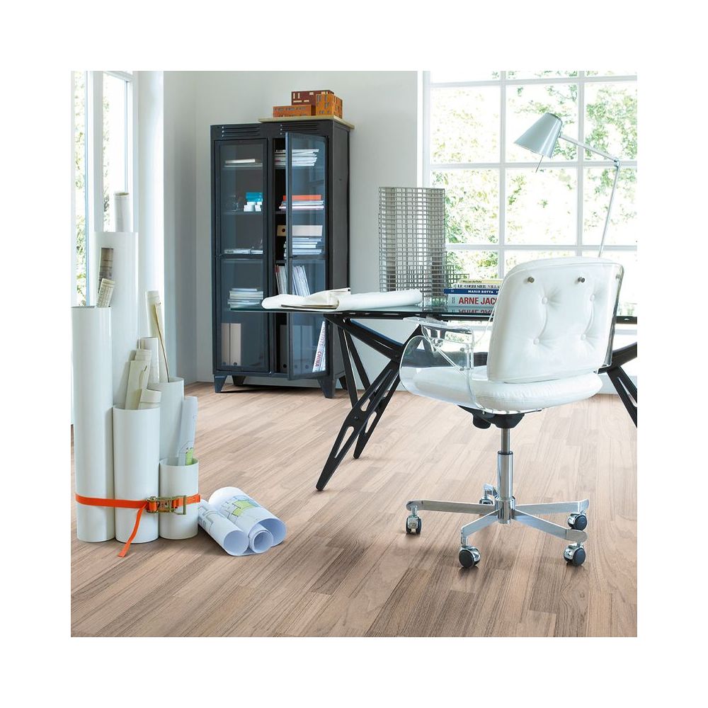 Basic 400 es un suelo laminado AC4 Clase 32, ideal para salones, dormitorios, pasillos y oficinas de tráfico moderado.
